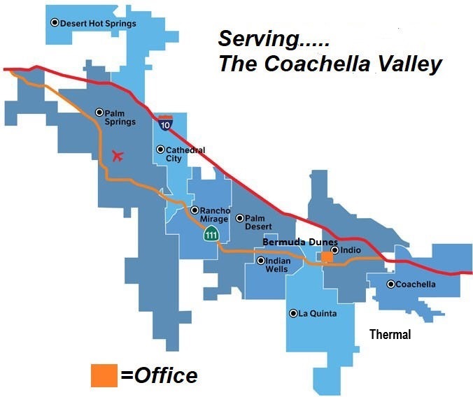 The area of the Coachella Valley includes the cities of Indio, Indian Wells, Palm Desert, Rancho Mirage, Palm Springs, La Quinta, Bermuda Dunes, Cathedral City, Desert Hot Springs, Coachella, Thermal.
